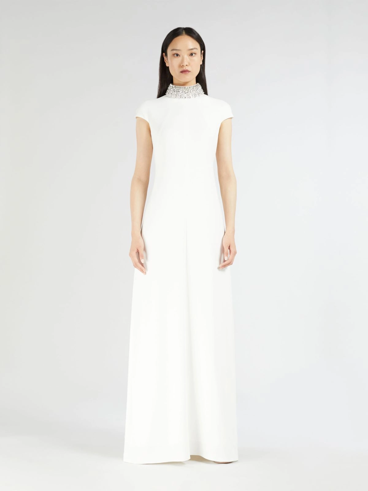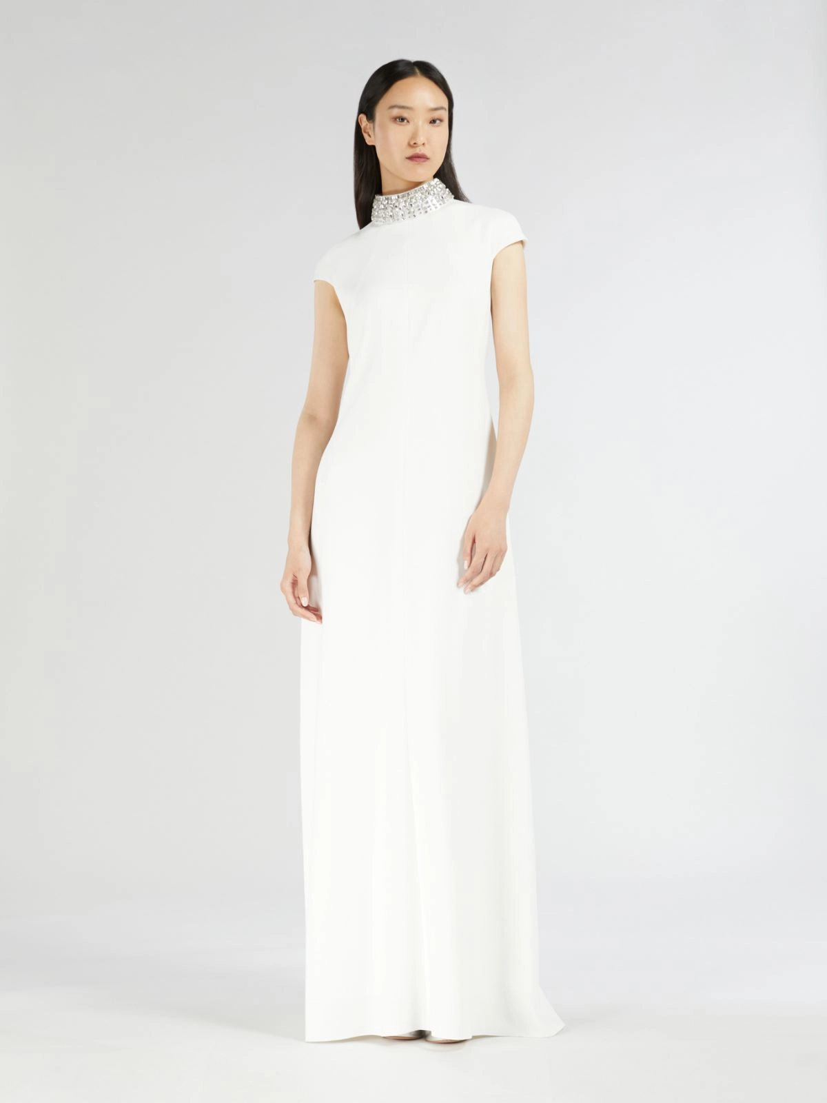 Robe longue, rehaussée d’un collier bijou amovible en tissu brodé de sequins et de cristaux.