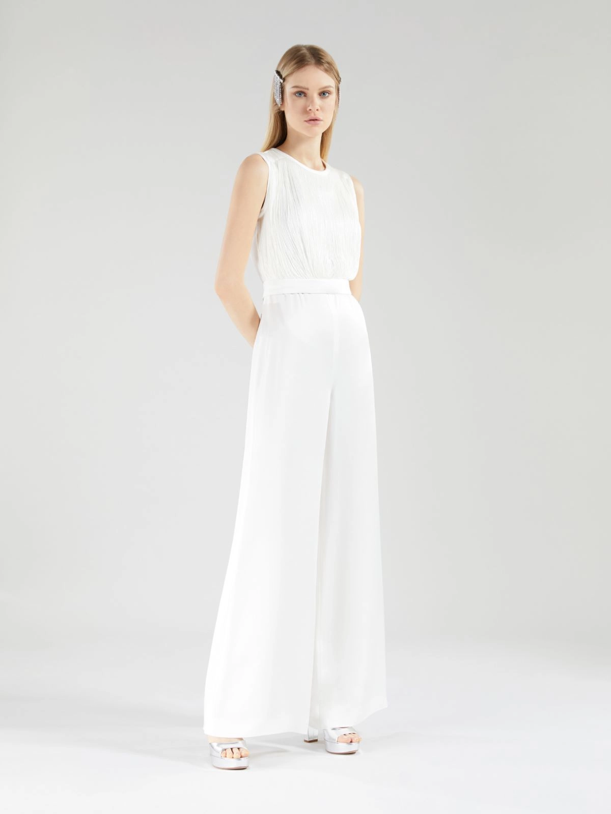 Combinaison sans manches, ornée sur le devant du corsage d’un délicat motif de franges en passementeries texturées.
